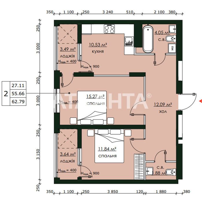 2-rooms apartment apartment by the address (area 62,8 m²) - Atlanta.ua